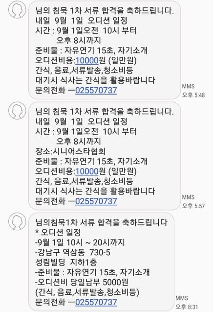 민지혁이 공개한 사진 속에는 영화 '님의 침묵'에 지원, 1차 합격한 배우에 다음 오디션 공지와 함께 오디션 비용 1만원을 요구하는 문자 내용이 담겨 충격을 주고 있다.
