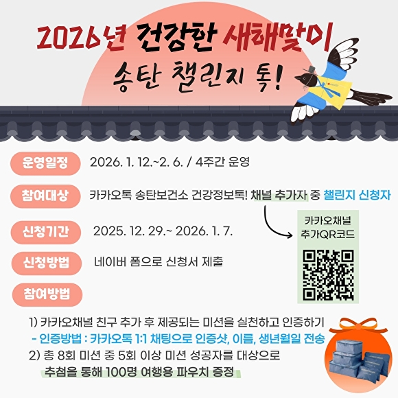 [조이뉴스24 양찬희 기자] 경기도 평택시는 송탄보건소가 오는 29일부터 2026년 1월 7일까지 건강한 새해맞이를 위한 ‘송탄 챌린지 톡!’ 1차 참여자를 모집한다고 밝혔다.