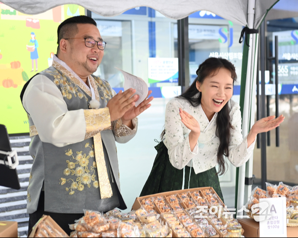 [조이뉴스24 정소희 기자] 산림조합이 추석을 맞아 10일 서울 송파구 산림조합중앙회 앞에서 곡식플러스와 함께 전통 수제 강정 및 가평 잣의 실속선물세트를 저렴한 가격에 판매하는 라이브 쇼핑 행사를 개최했다. 일일 쇼호스트로 나선 개그맨 송영길과 가수 강소리가 제품을 소개하고 있다.