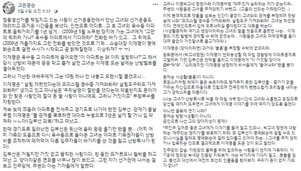 고은광순 씨는 자신의 SNS에 "선거운동 판에서 처음 만난 두 사람이 1년 넘게 옥수동 아파트에서 뜨거운 시간을 보냈다"고 말했다.