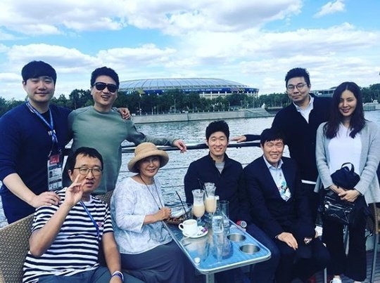 공개된 사진은 모스크바강 유람선에서 찍은 단체 사진으로, 차범근 전 감독과 부인 오은미 씨, 배우 한채아, 박지성·박문성 해설위원, 배성재 아나운서가 함께했다.